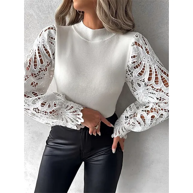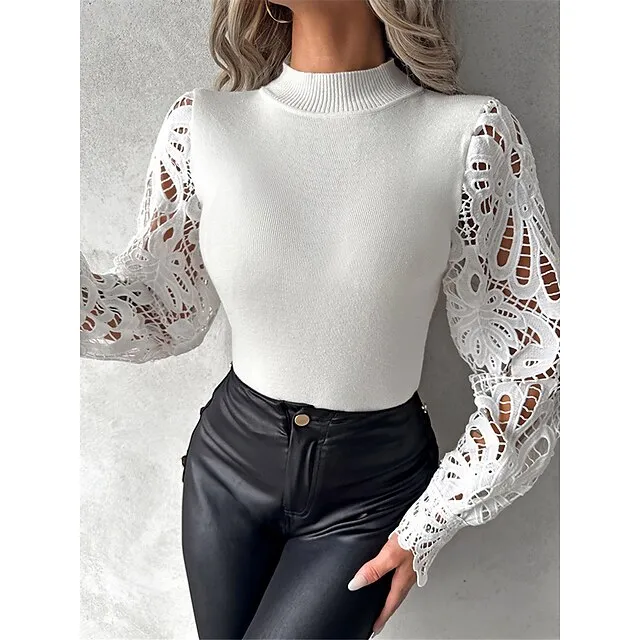 Blouse Women's White Plain Lace Patchwork Going out Fashion Streetwear Standing Collar Regular Fit S