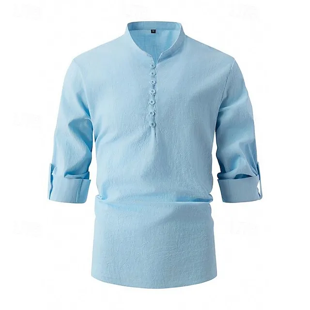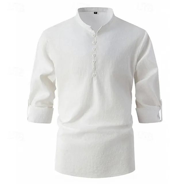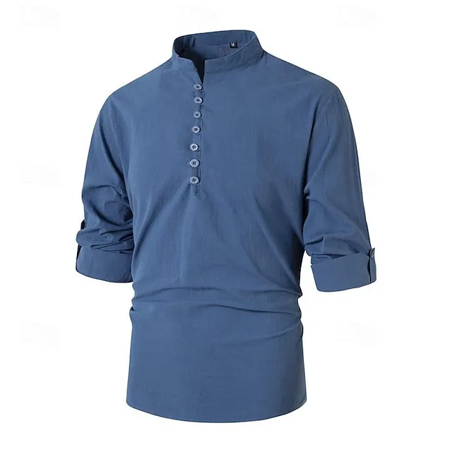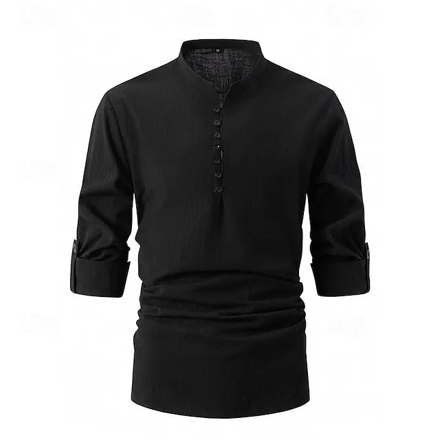Men’s Linen Shirt Shirt Casual Shirt Black White Navy Blue Long Sleeve Plain Standing Collar Spring & Fall Hawaiian Holiday Clothing Apparel