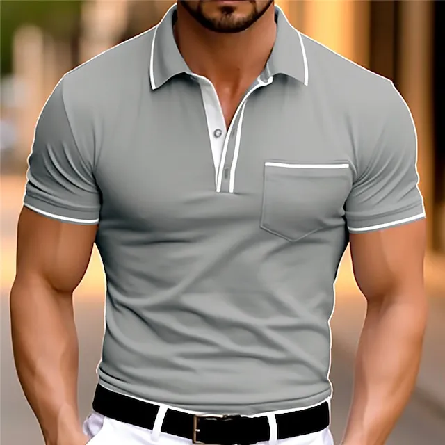 Men's Polo Shirt Button Up Polos Casual Sports Lapel Short Sleeve Fashion Basic Color Block Patchwork Front Pocket Summer Regular Fit Deep Green Navy Blue Gray Polo Shirt