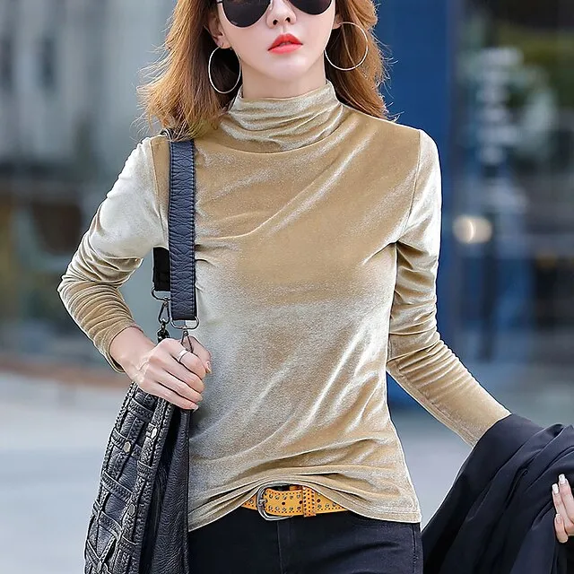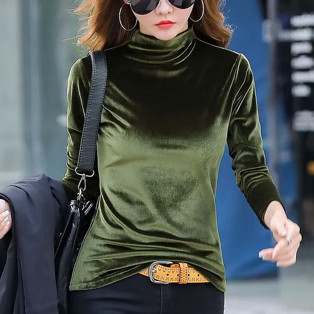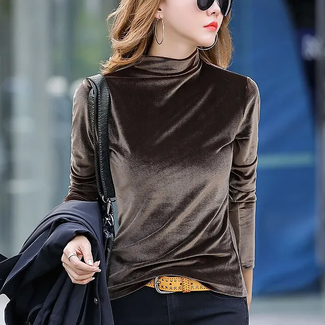 Shirt Blouse Women’s Black Army Green Brown Solid / Plain Color Sexy Daily Warm Fashion High Neck Velvet Regular Fit S