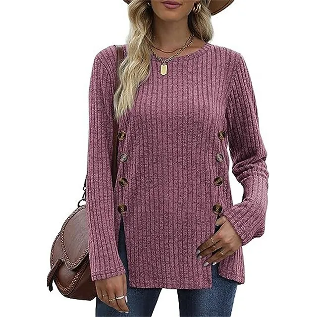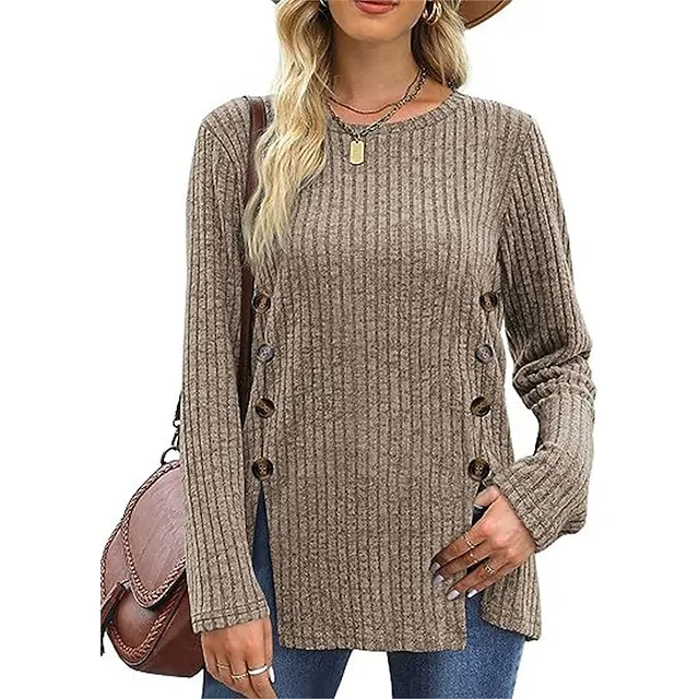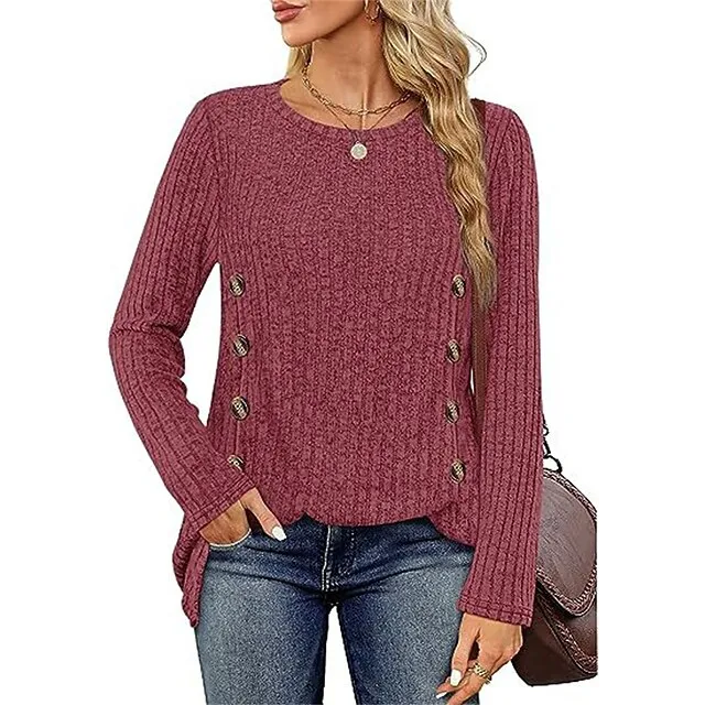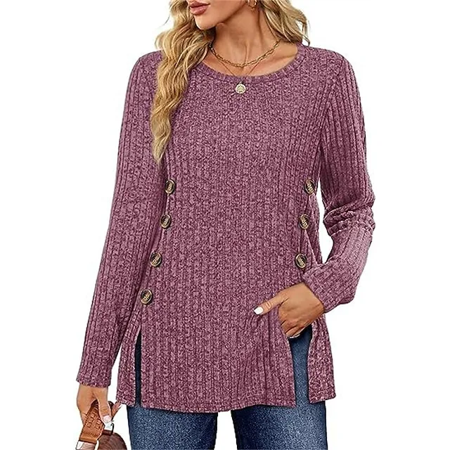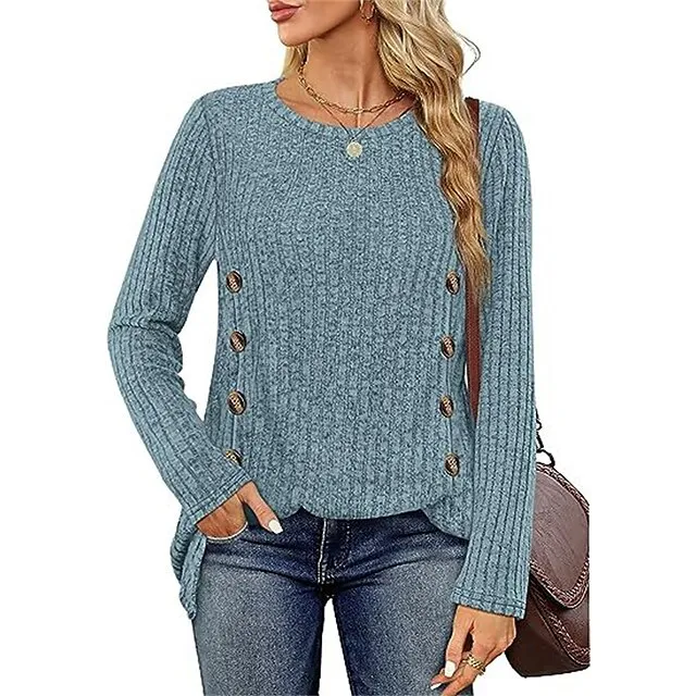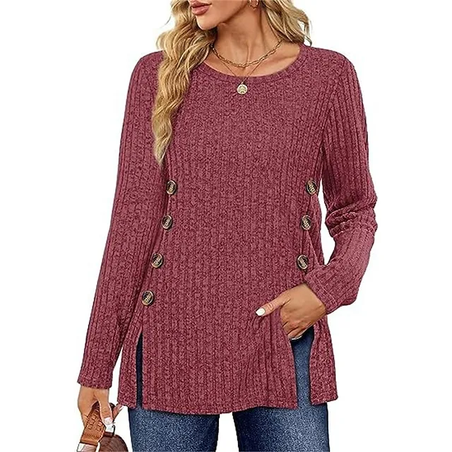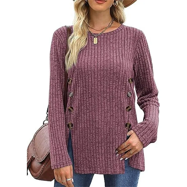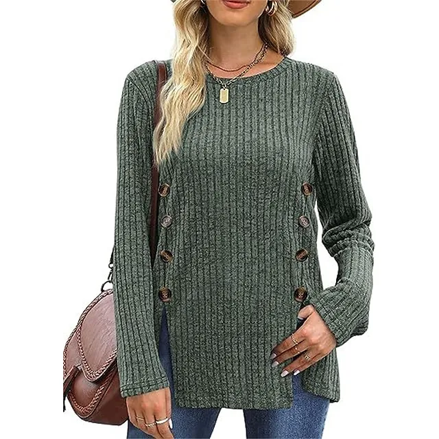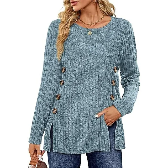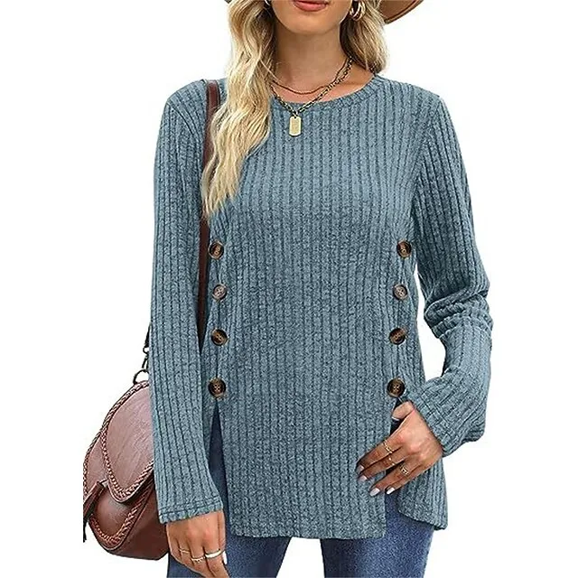 T shirt Tee Women’s Black Red Blue Solid / Plain Color Button Split Daily Fashion Round Neck Regular Fit S