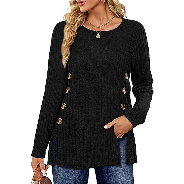 T shirt Tee Women's Black Red Blue Solid / Plain Color Button Split Daily Fashion Round Neck Regular Fit S