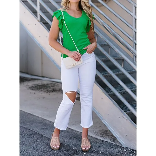 T shirt Tee Women’s Black White Green Solid Color Ruffle Street Daily Fashion V Neck S