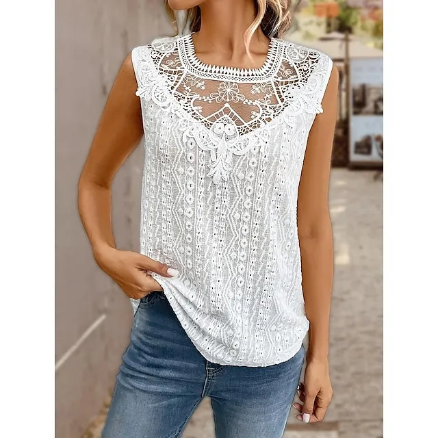 Tank Women's White Solid Color Lace Street Daily Fashion Round Neck S