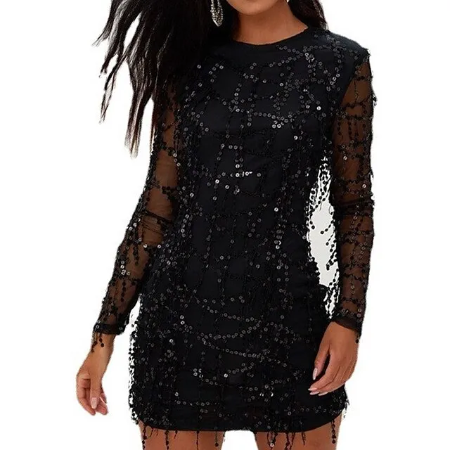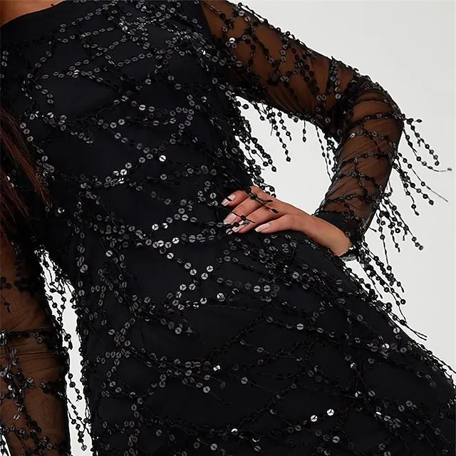 Women's Black Sequin Dress Fringe Dress Party Dress Sparkly Dress Little Black Dress Sexy Dress Black Homecoming Dress Mini Dress Long Sleeve Fall Winter Crew Neck Fashion