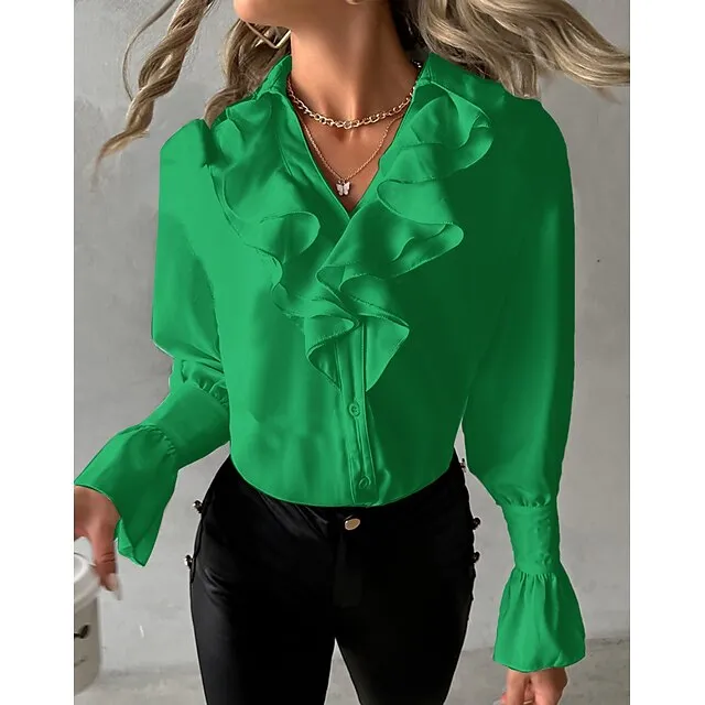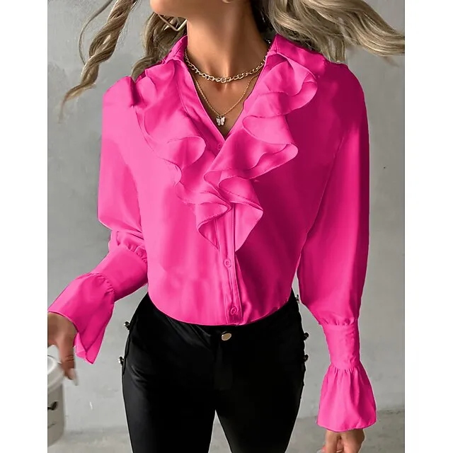 Women’s Blouse Plain Petal Sleeve Black White Yellow Ruffle Long Sleeve Elegant V Neck Form Fit Fall
