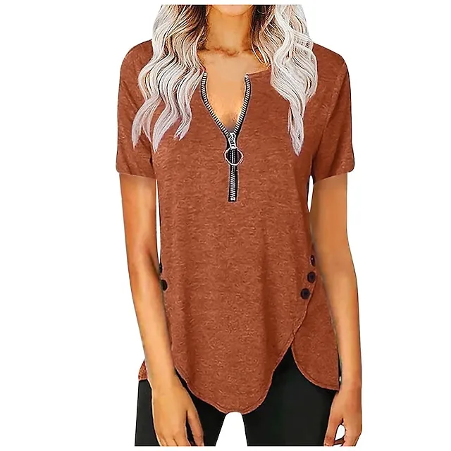 Women‘s Casual Short-Sleeved Top V-Neck Zipper Solid Color Button T-shirt Blouse