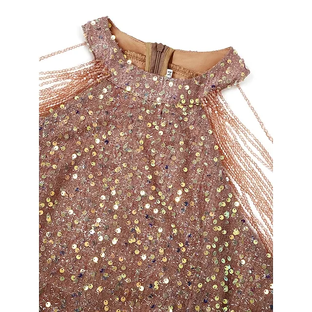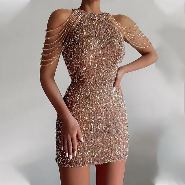 – The dress design features shimmering sparkle and shimmer, creating a mini dress length that is perfect for all seasons, including spring, summer, fall, and winter.