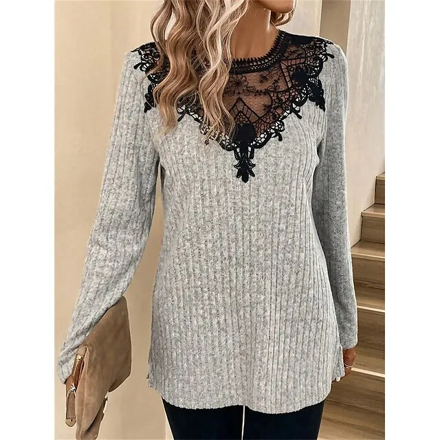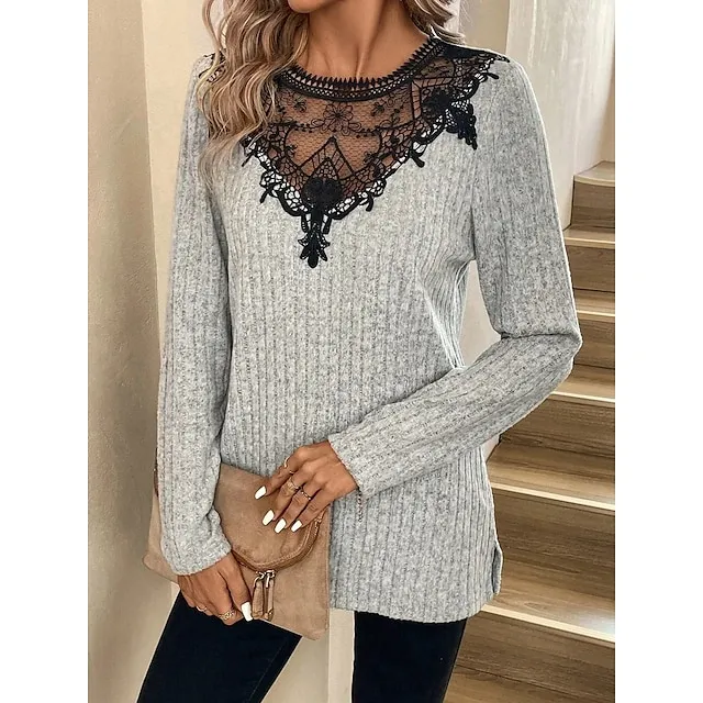 Women’s Lace Shirt Shirt Blouse Color Block Casual Gray Lace Patchwork Long Sleeve Elegant Fashion Basic Round Neck Regular Fit Spring Fall