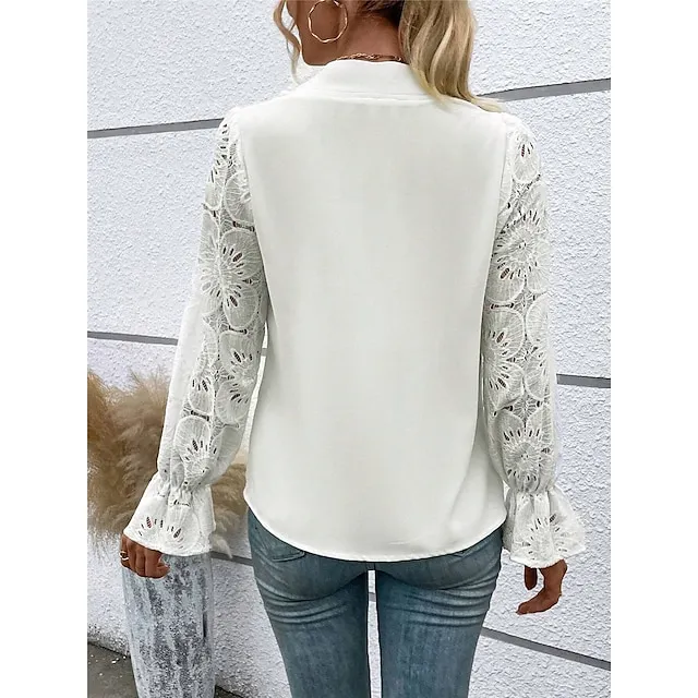 Women’s Lace Shirt Shirt Blouse Plain Bell Sleeve White Lace Patchwork Long Sleeve Work Going out Fashion Modern V Neck Regular Fit Spring