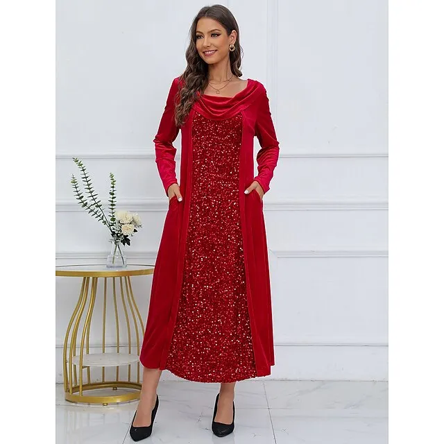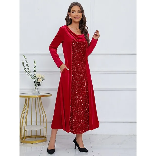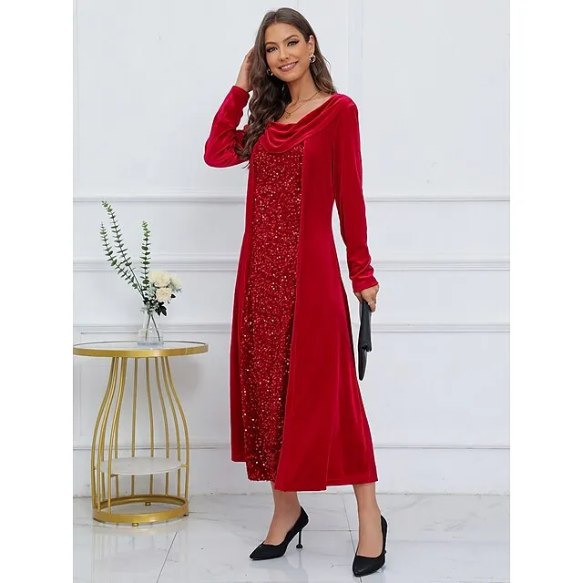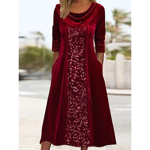 Women’s Sequin Dress Velvet Dress Party Dress Sparkly Dress Christmas Midi Dress Wine Long Sleeve Sparkly Glitter Spring Fall Winter Crew Neck Dress