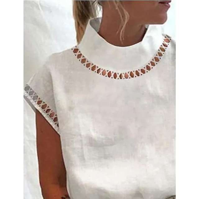 Women’s Shirt Blouse Turtleneck shirt White Eyelet Tops Plain Casual White Blue Cut Out Short Sleeve Basic Standing Collar Regular Fit