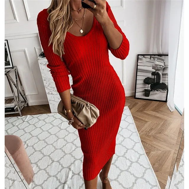 Women’s Sweater Dress Jumper Dress Winter Dress Midi Dress Knitwear Fashion Basic Pure Color Outdoor Daily Vacation Fall Dress V Neck Long Sleeve Ruched Knit Regular Fit Black Red Blue S M L XL