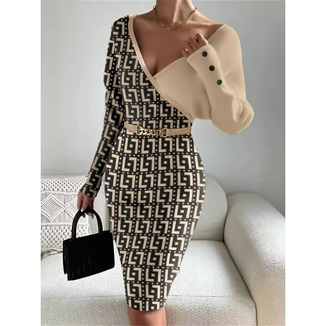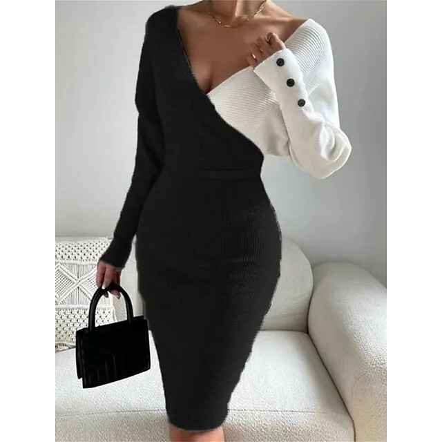Women's Sweater Dress Jumper Dress Winter Dress Midi Dress Knitwear Fashion Casual Geometric Color Block Outdoor Daily Vacation Going out V Neck Long Sleeve Button Belted Regular Fit Black