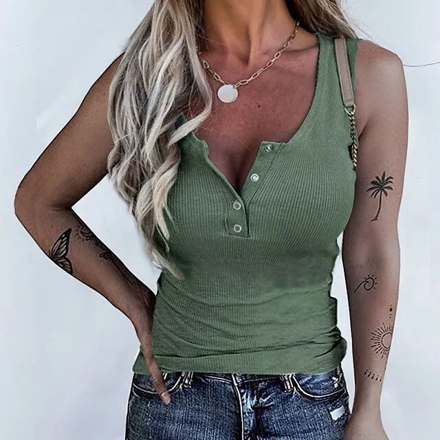 Women’s Tank Top Going Out Tops Henley Shirt Plain Casual Daily Sports White Patchwork Sleeveless Casual V Neck Slim