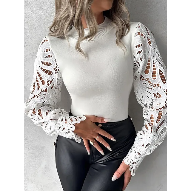 Blouse Women’s White Plain Lace Patchwork Going out Fashion Streetwear Standing Collar Regular Fit S