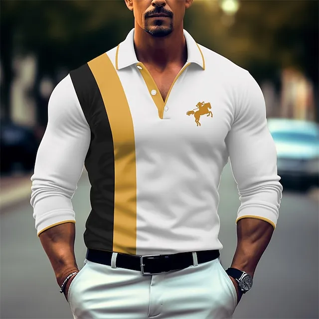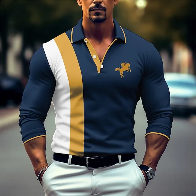 Men's Polo Shirt Button Up Polos Casual Sports Lapel Long Sleeve Fashion Basic Color Block Patchwork Embroidered Spring & Fall Regular Fit White Red Navy Blue Dark Green Polo Shirt