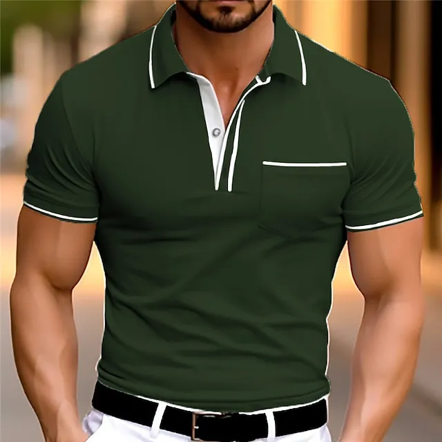 Men's Polo Shirt Button Up Polos Casual Sports Lapel Short Sleeve Fashion Basic Color Block Patchwork Front Pocket Summer Regular Fit Deep Green Navy Blue Gray Polo Shirt