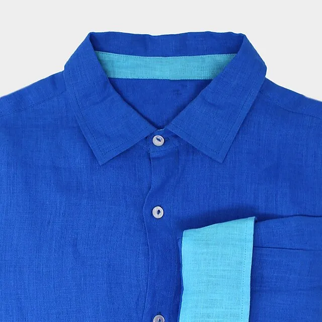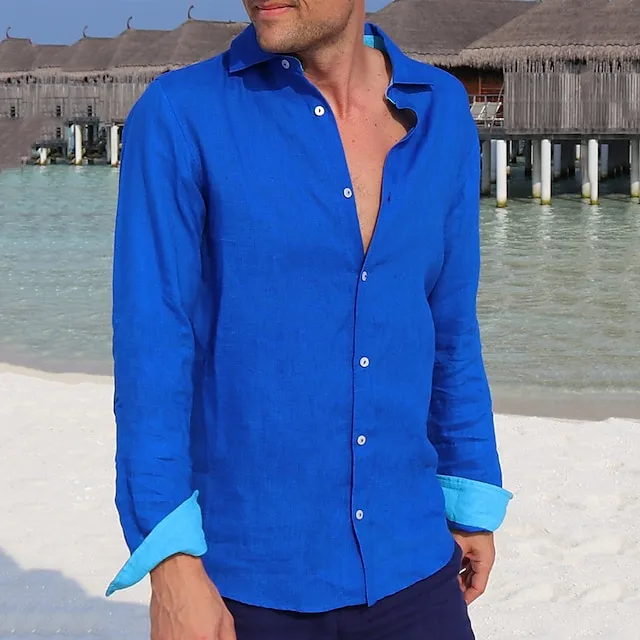 Men's Shirt Linen Shirt Button Up Shirt Beach Shirt Blue Long Sleeve Color Block Lapel Spring & Fall Casual Daily Clothing Apparel Splice