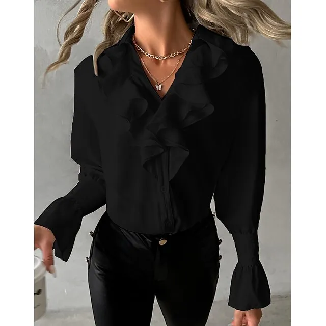 Women’s Blouse Plain Petal Sleeve Black White Yellow Ruffle Long Sleeve Elegant V Neck Form Fit Fall