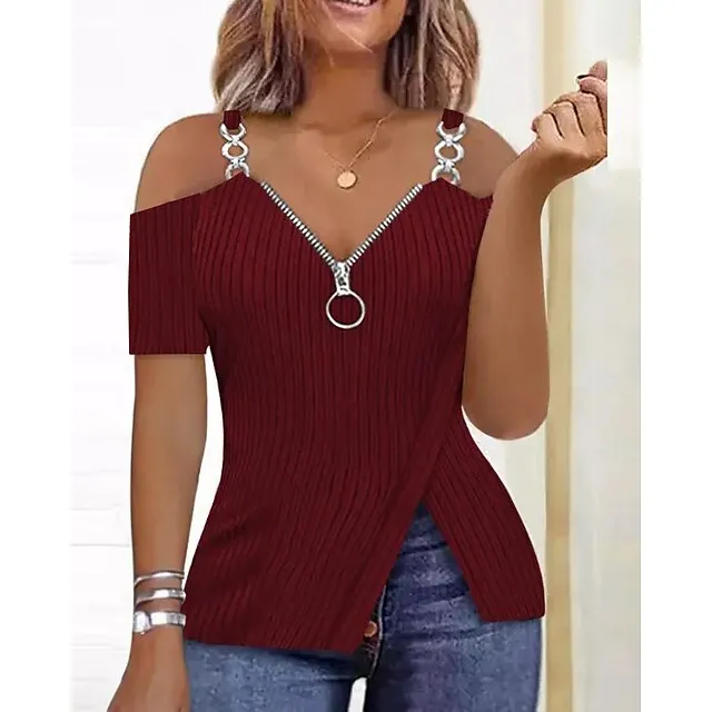 Women's Blouse Ribbed Plain Casual Cold Shoulder Pink Quarter Zip Short Sleeve Classic Casual Half Zip V Neck Regular Fit Summer Spring Fall