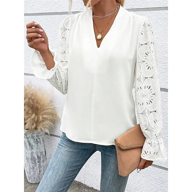 Women’s Lace Shirt Shirt Blouse Plain Bell Sleeve White Lace Patchwork Long Sleeve Work Going out Fashion Modern V Neck Regular Fit Spring
