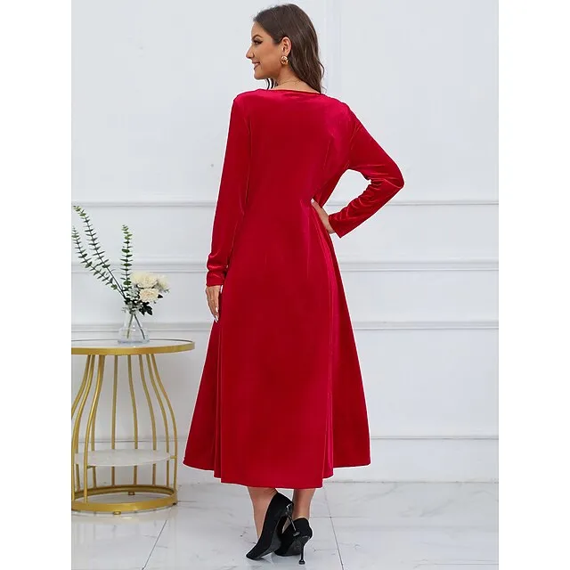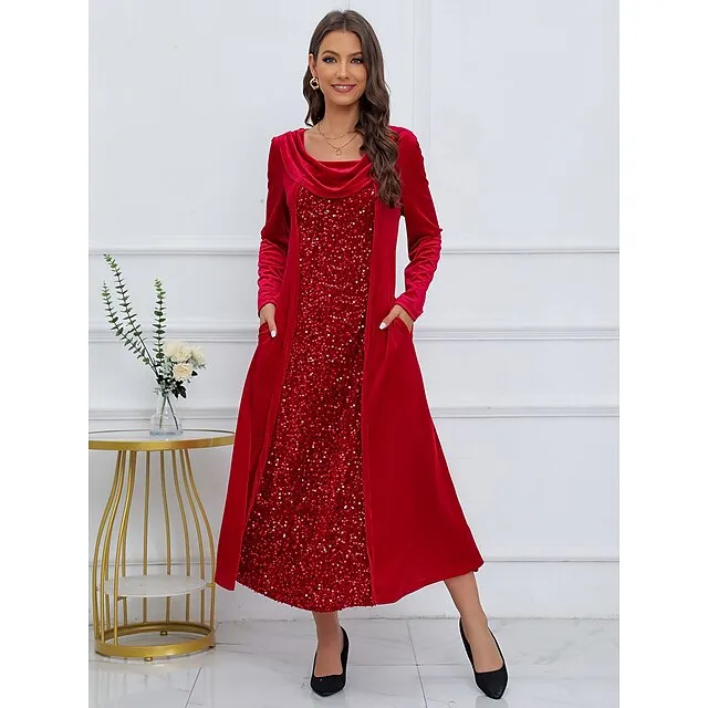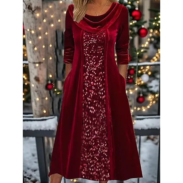 Women’s Sequin Dress Velvet Dress Party Dress Sparkly Dress Christmas Midi Dress Wine Long Sleeve Sparkly Glitter Spring Fall Winter Crew Neck Dress