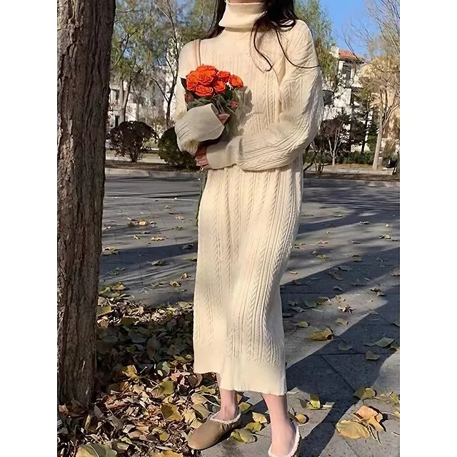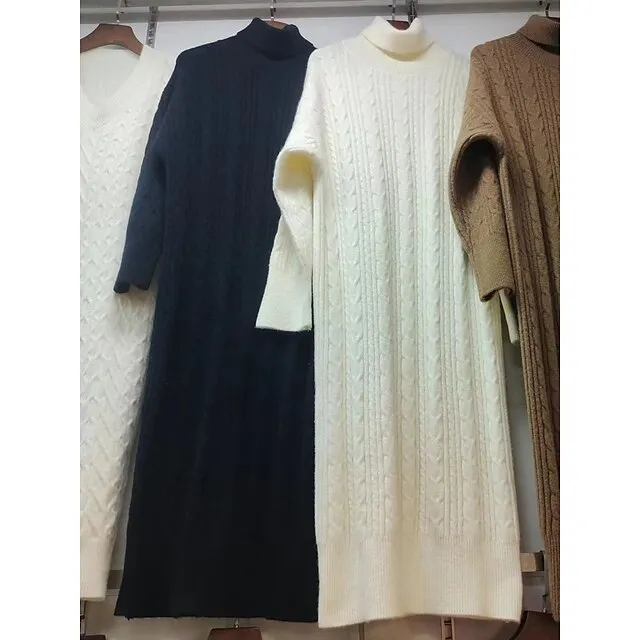 Women's Sweater Dress Jumper Dress Winter Dress Midi Dress Knitwear Fashion Daily Pure Color Outdoor Casual Daily Holiday Turtleneck Long Sleeve Patchwork Loose Fit Black Brown Beige One Size